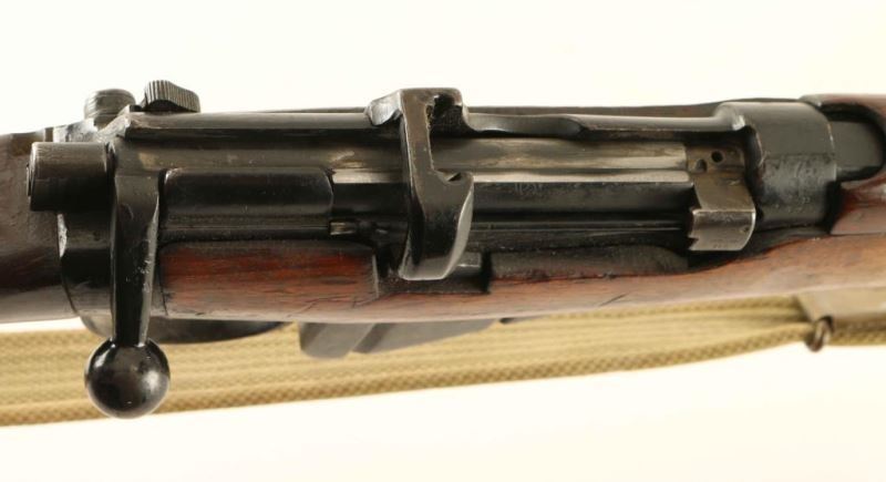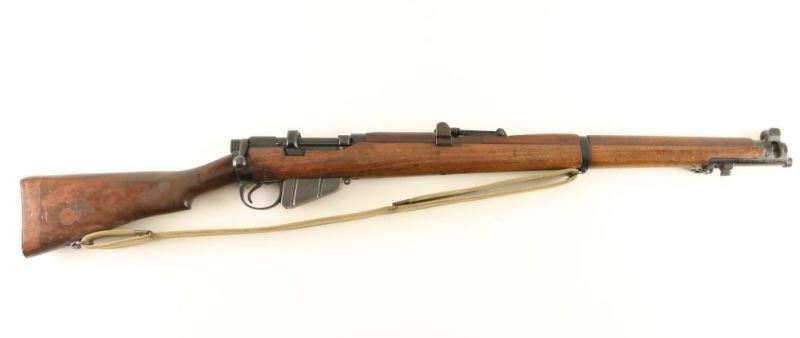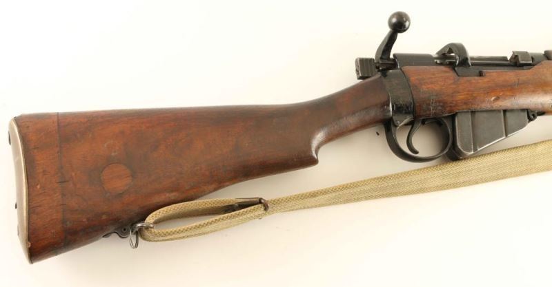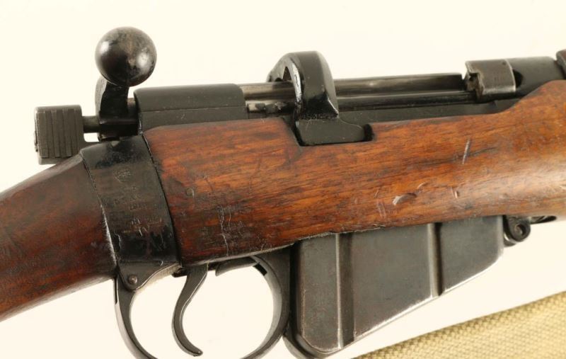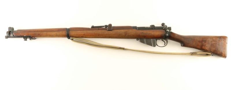 British military single shot bolt action training rifle chambered in .22 caliber rimfire. Features a black painted finish, 25.2" barrel, raised patridge front sight, leaf style rear sight graduated to 2,000 yards, metal nose cap with protective sight ears, bayonet lug & piling swivel, serrated trigger, hollowed .303 magazine that acts as a brass collector, manual safety on the left side of the receiver, tan canvas sling, integral charge loading bridge on the receiver, smooth full-length wood handguard & forend and straight grip shoulder stock with extension & brass trapdoor buttplate. The right side of the butt socket is marked "[crown]/G.R/L.S.A. Co/1918/Sht .22/IV" and the barrel & receiver show nitro proof marks for the .22 LR cartridge. The bold head is stamped ".22 No2/NS." Serial numbers match on the receiver, barrel, bolt handle, rear sight and nose cap. Rifle retains approximately 75% of it's black paint finish showing scattered wear with brown patina making up the balance. Action is sound, the bore is very good+ and the wood stocks are good to very good. Condition is NRA Very Good. ***C&R Firearm*** From The John F Sukey Collection