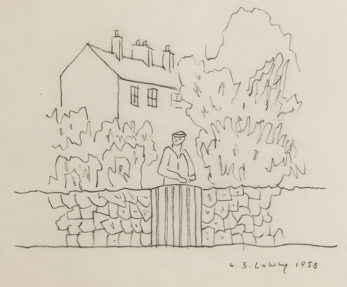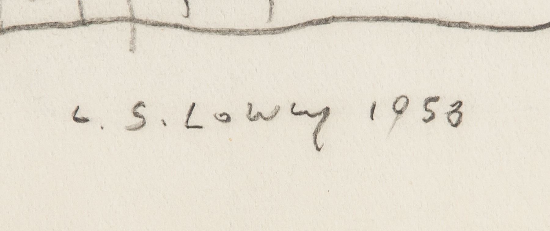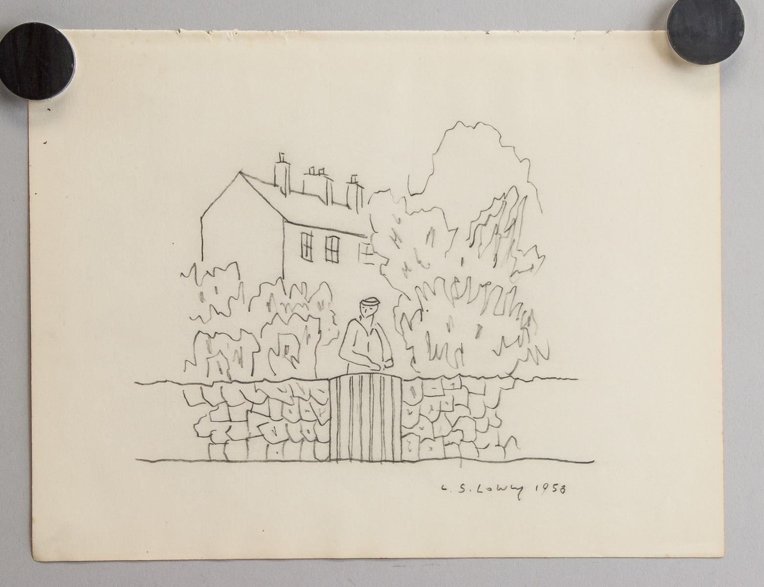 Graphite on paper. Featuring a countryhouse with a post officer. Signed and attributed to L. S. Lowry (British, 1887-1976) on the lower right corner and dated 1958. Attributed to Laurence Stephen Lowry (1887-1976, British). 17 x 22.5 cm (6.7 x 8.9 inches). Provenance: This lot carries limited provenance from an Upper New York estate
