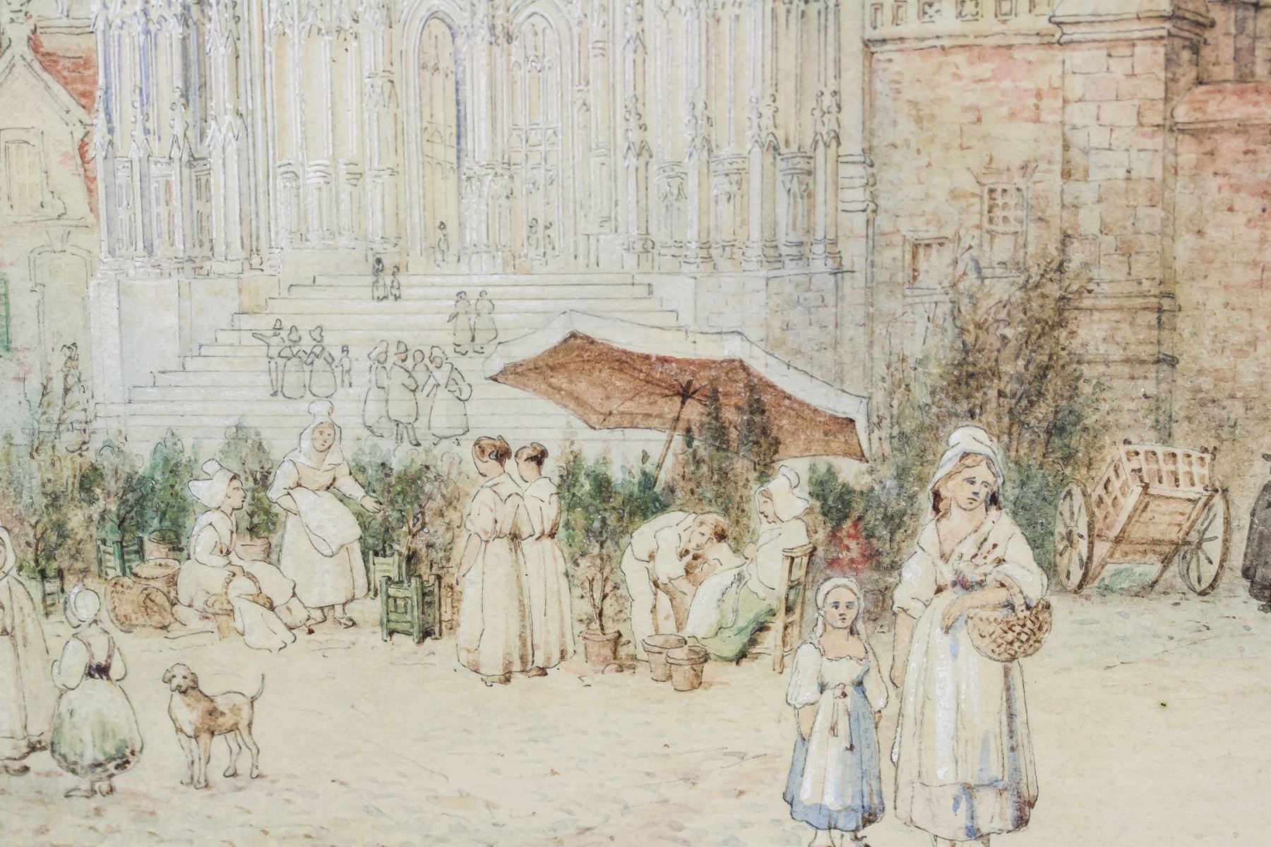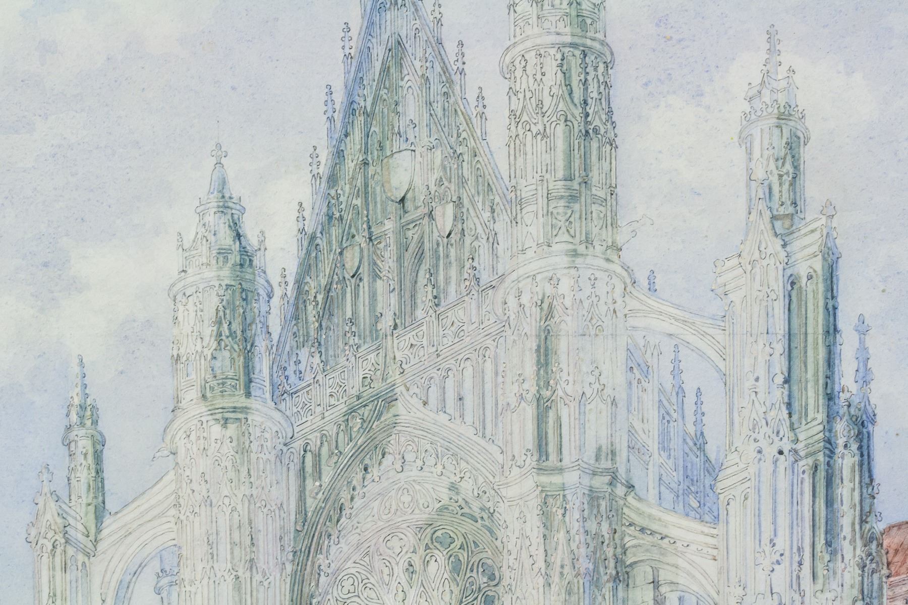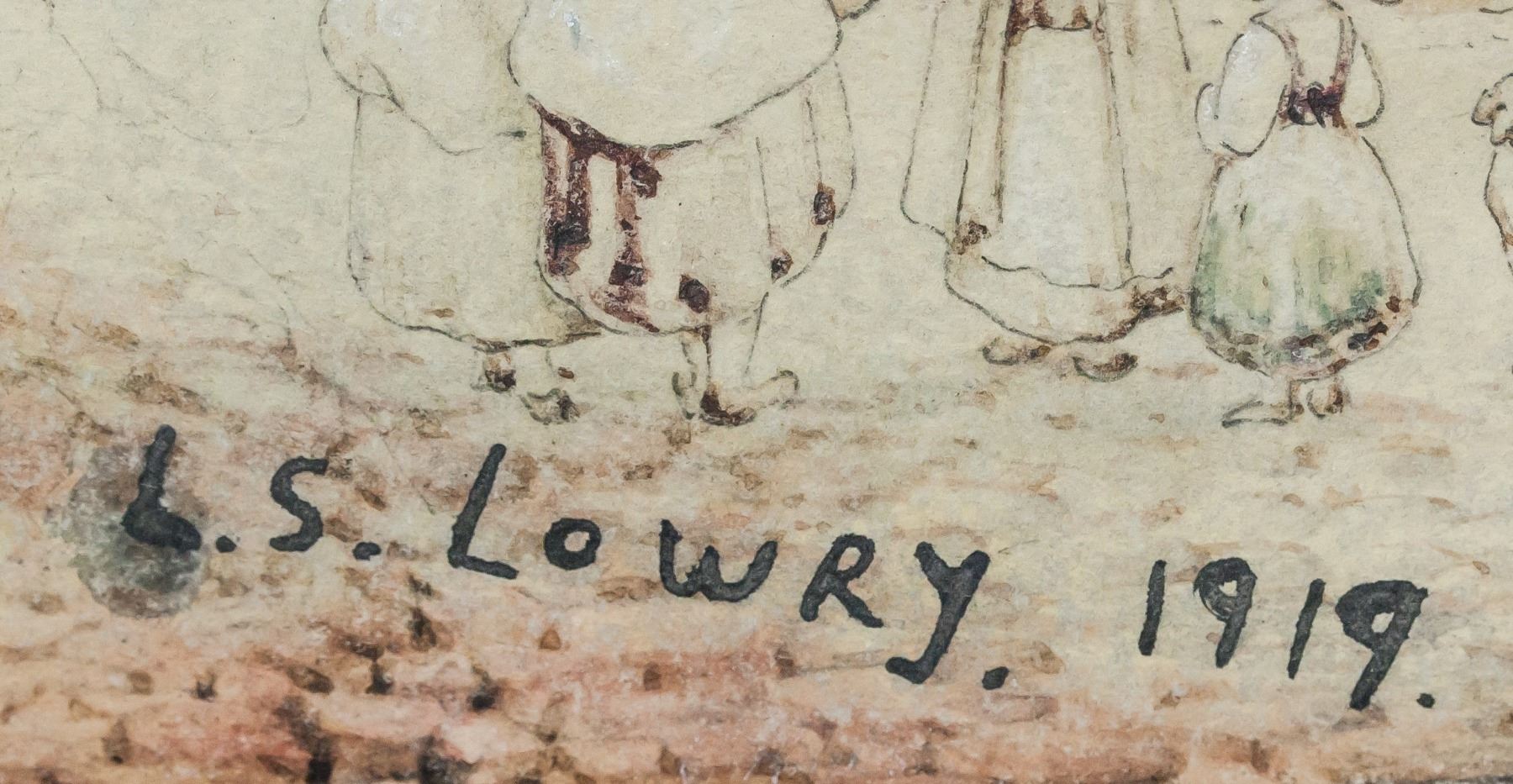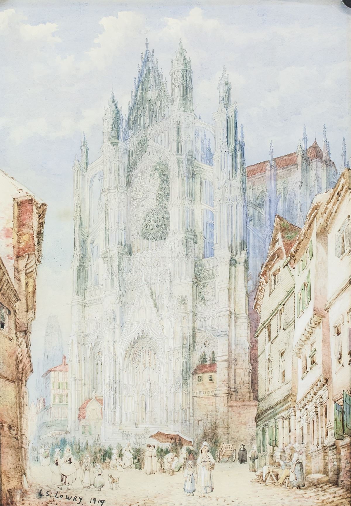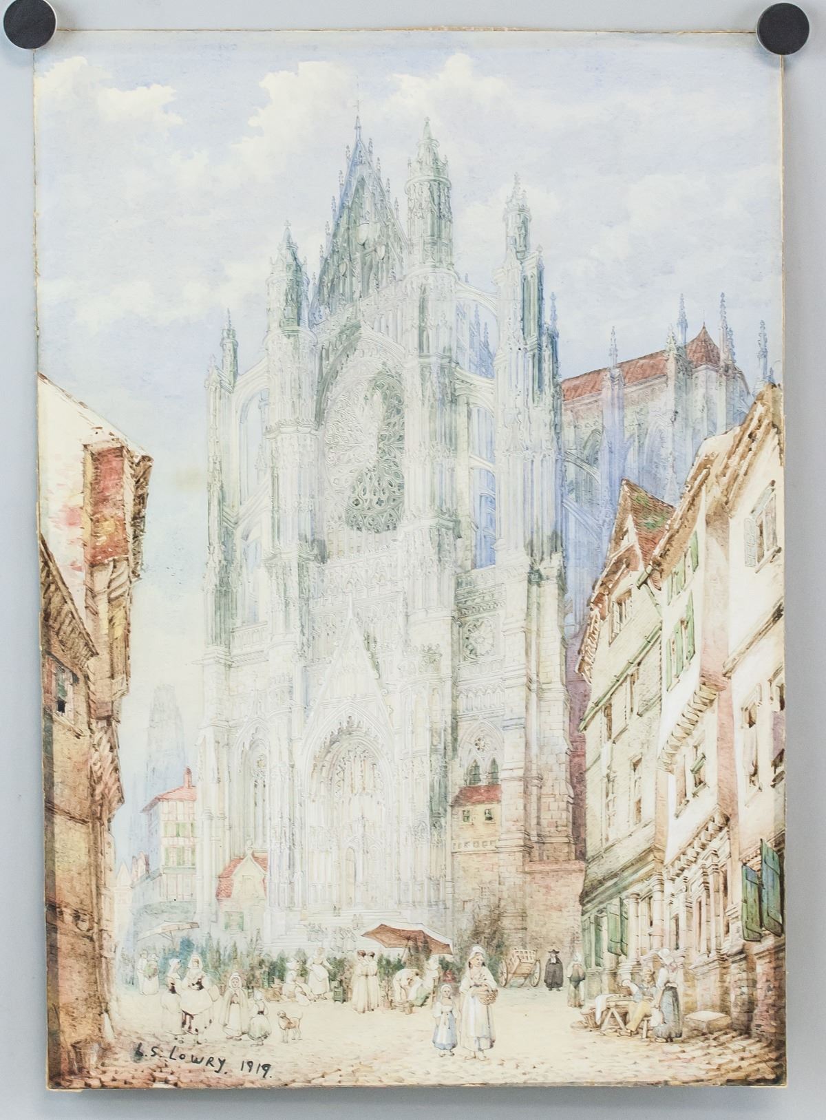 Watercolor on board. Featuring large cathedral. Signed ""L. S. Lowry" in the bottom left corner, with "1919" inscribed beside the signature. Label affixed to verso stamped with "L. S. Lowry 1887-1976" and "Galerie Beyeler PARIS". Attributed to L. S. Lowry (1887-1976, British). 51 x 35.5 cm (20 x 14 inches). Provenance: This lot carries limited provenance from a Private English collection