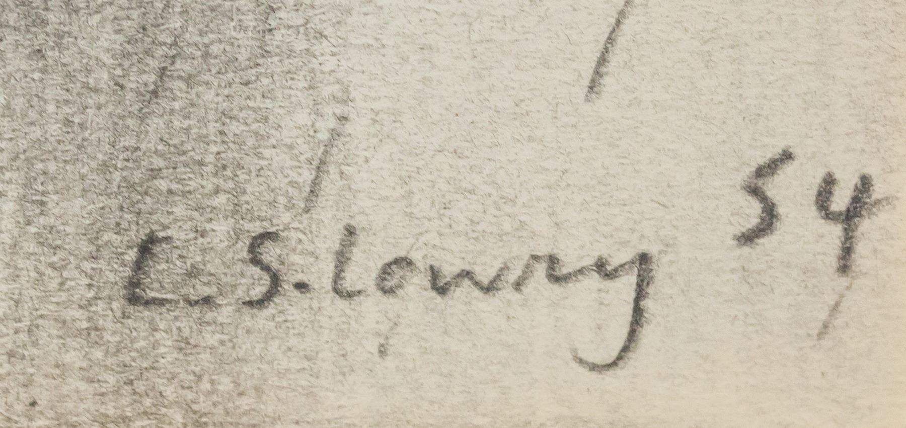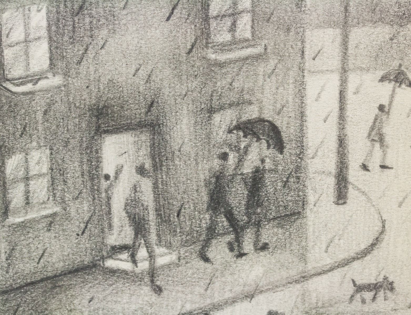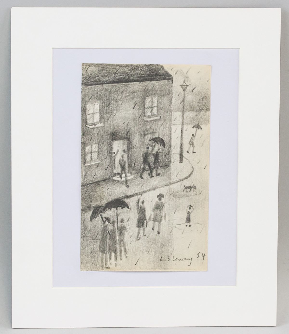 Graphite on paper. Featuring scene of rainy day. Signed "L. S. Lowry" in the bottom right corner with "54" inscribed beside the signature. Attributed to L. S. Lowry (1887-1976, English). 20 x 12 cm (7.75 x 4.75 in), Mat: 30.5 x 25 cm (12 x 10 in).