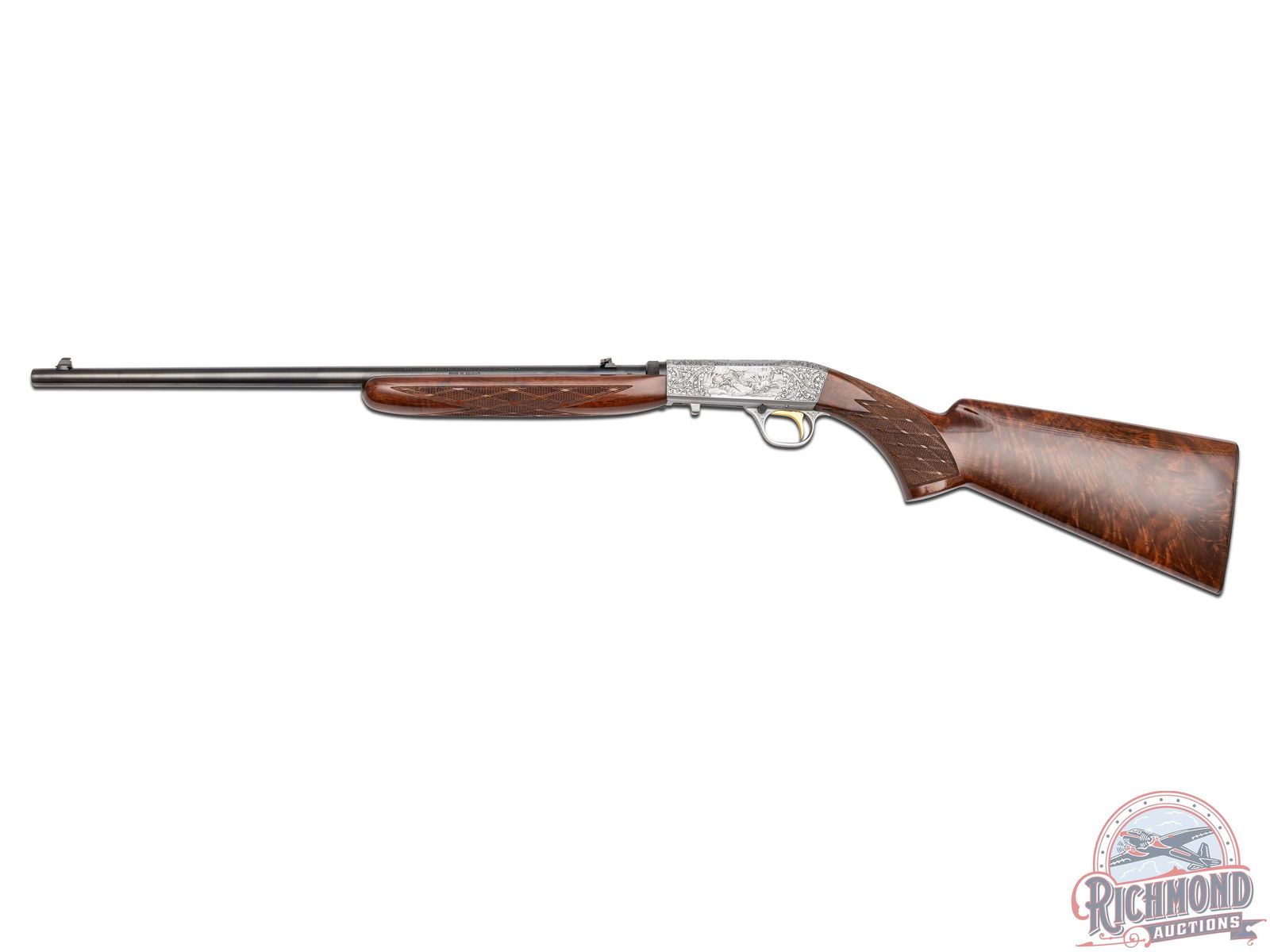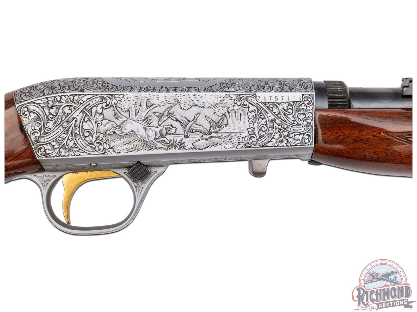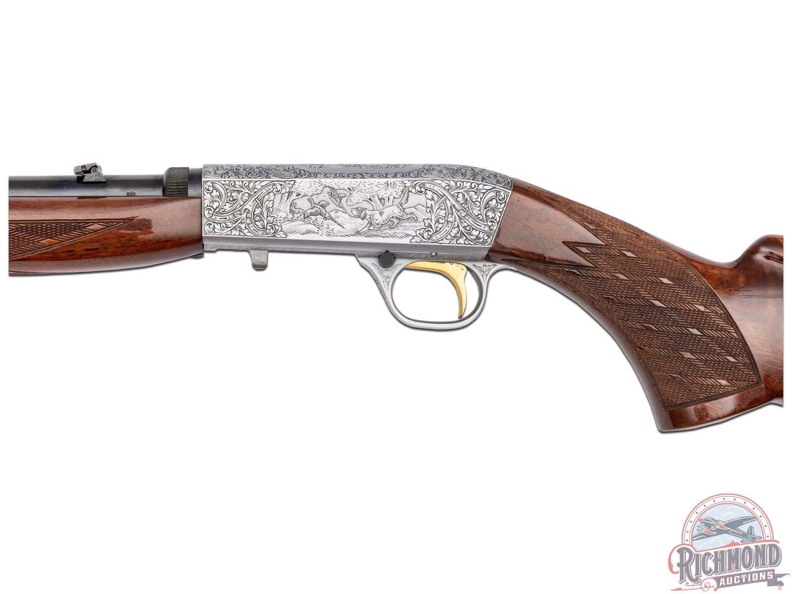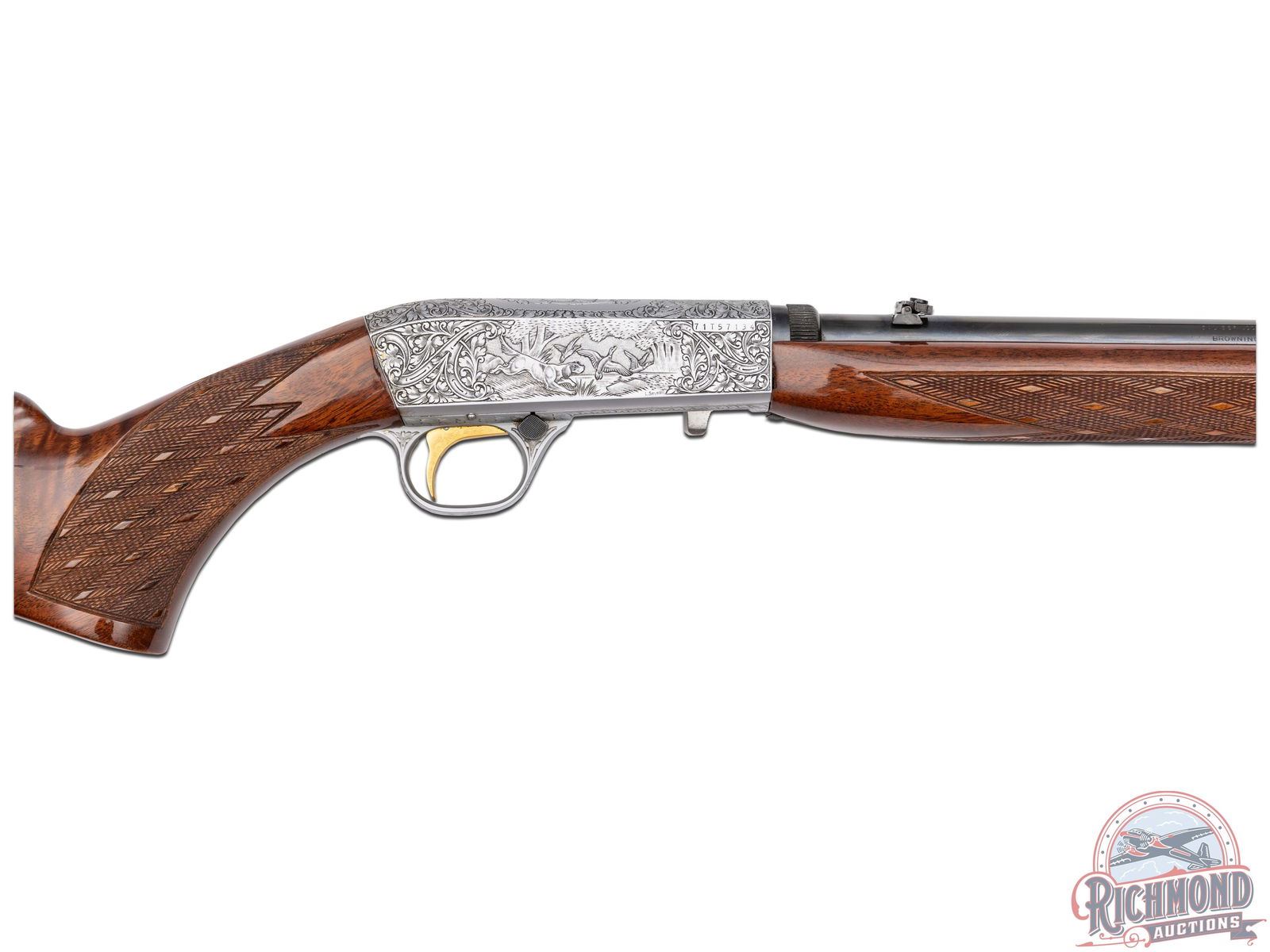 Made in Herstal, Belgium by Browning in 1971. 19-1/4" blued round steel barrel with standard sights and factory plugged and drilled for scope mounting holes with Browning Utah and Montreal addresses in 22 Long rifle caliber. Satin finish takedown Grade III style engraved receiver with dog and bird scenes with block surrounded serial number "71T57134" and engraved signed by "L. Severin". Action has gold-plated trigger and push button safety. Figured walnut skip-line checkered pistol grip stock with side loading port, blued serrated steel butt plate, and detachable tube magazine. Walnut matching skip-line checkered swelled forearm. LOP: 13-3/4". DAC: 1-3/16". DAH: 2-5/8". CALIBER: 22LR. S/N: 71T57134. FFL STATUS: Curio & Relic.