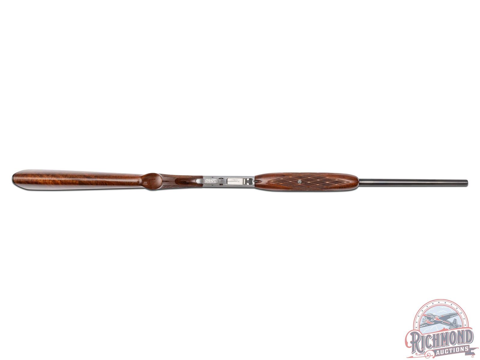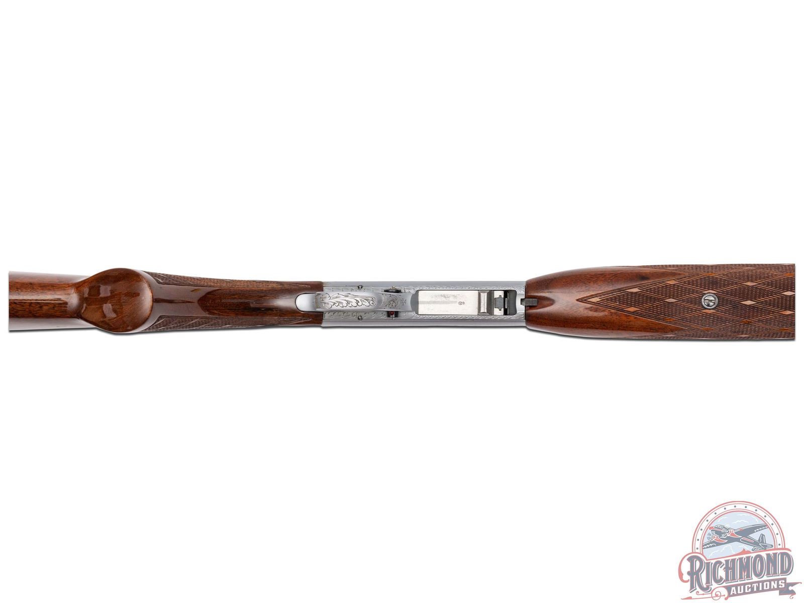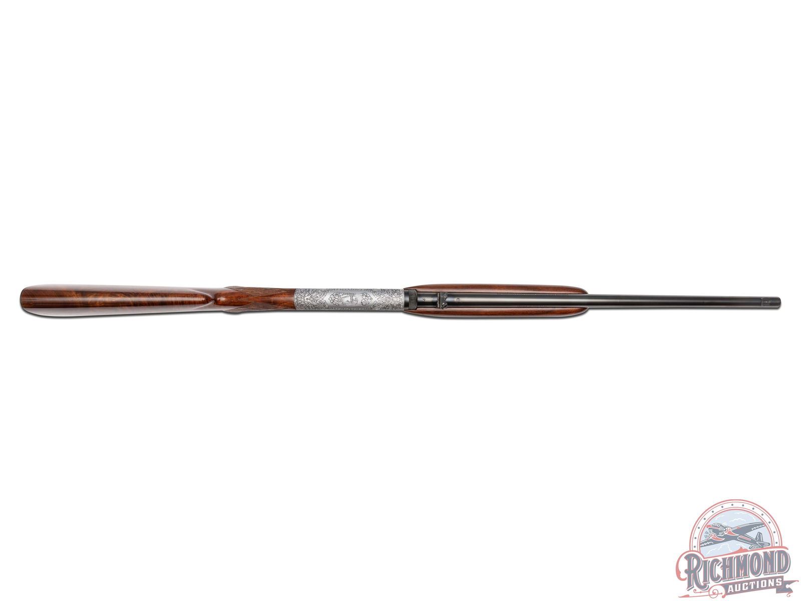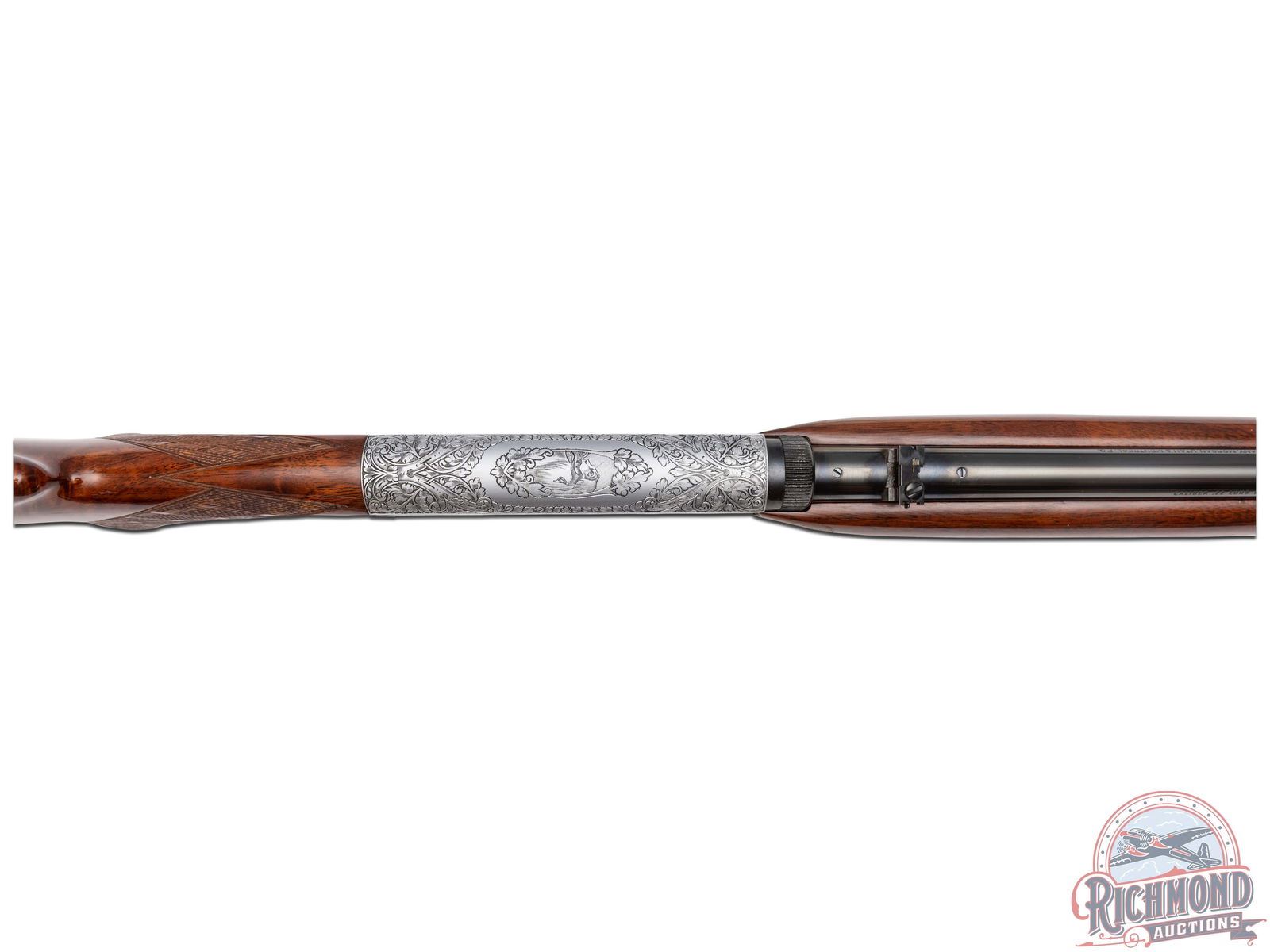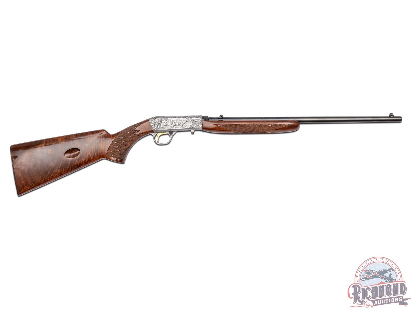 Made in Herstal, Belgium by Browning in 1971. 19-1/4" blued round steel barrel with standard sights and factory plugged and drilled for scope mounting holes with Browning Utah and Montreal addresses in 22 Long rifle caliber. Satin finish takedown Grade III style engraved receiver with dog and bird scenes with block surrounded serial number "71T57134" and engraved signed by "L. Severin". Action has gold-plated trigger and push button safety. Figured walnut skip-line checkered pistol grip stock with side loading port, blued serrated steel butt plate, and detachable tube magazine. Walnut matching skip-line checkered swelled forearm. LOP: 13-3/4". DAC: 1-3/16". DAH: 2-5/8". CALIBER: 22LR. S/N: 71T57134. FFL STATUS: Curio & Relic.