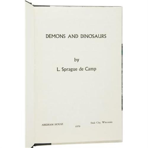 <B>L. Sprague de Camp: </B></I><B><I>Demons and Dinosaurs</B></I></B></I>. (Sauk City, WI: Arkham House, 1970), first edition of only 500 issued, 72 pages, dust jacket design by Frank Utpatel, black cloth with gilt titles, dust jacket (not price clipped), 12mo (5” x 7.5”), about fine in a near fine jacket.<BR><BR><b>Shipping:</b> Books & Catalogs (<a target="_blank" href="http://www.heritageauctions.com/common/shipping.php">view shipping information</a>)