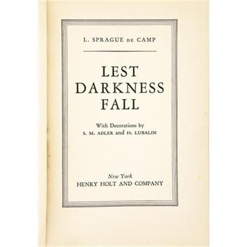 <B>L. Sprague de Camp. </B></I><B><I>Lest Darkness Fall</B></I></B></I><B>. </B></I>New York: Henry Holt and Company, 1941.<BR> <BR>First edition. Octavo. 379 pages. With chapter head decoration by S. M. Adler and H. Lubalin.<BR><BR>Publisher's black cloth with titles and illustration in white on the spine and front cover. Shelf wear to the boards with rubbing at the head and foot of the spine. Corners slightly bumped. Contents slightly toned. Very good. <I>From the Robert and Diane Yaspan Collection.</B></I><BR><BR><b>Shipping:</b> Books & Catalogs (<a target="_blank" href="http://www.heritageauctions.com/common/shipping.php">view shipping information</a>)