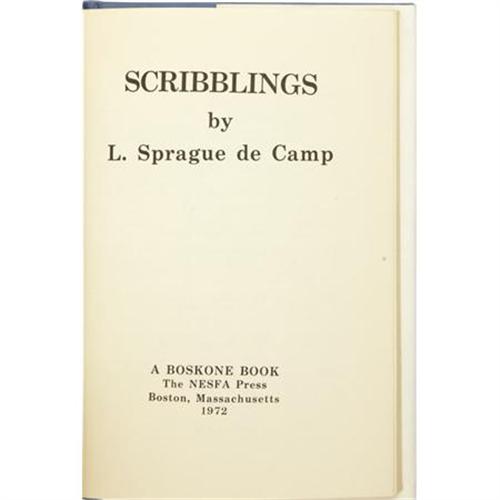 <B>L. Sprague de Camp.</B></I><B><I> Scribblings</B></I></B></I>. Boston: The NEFSA Press, 1972. <BR>First edition. Twelvemo. 95 pages. <BR><BR>Blue cloth with silver spine titles. Overall, book and dust jacket are very fine. <I>From the Robert and Diane Yaspan Collection.</B></I><BR><BR><b>Shipping:</b> Books & Catalogs (<a target="_blank" href="http://www.heritageauctions.com/common/shipping.php">view shipping information</a>)