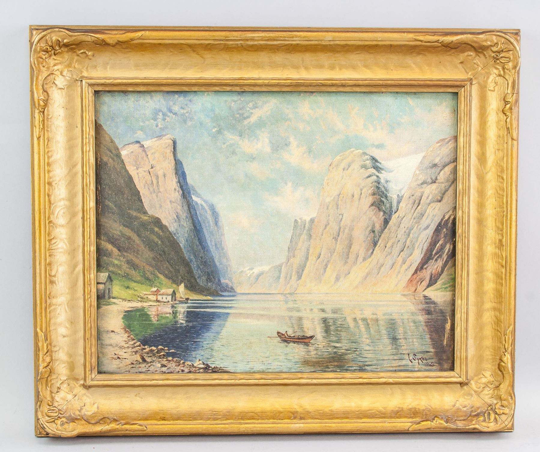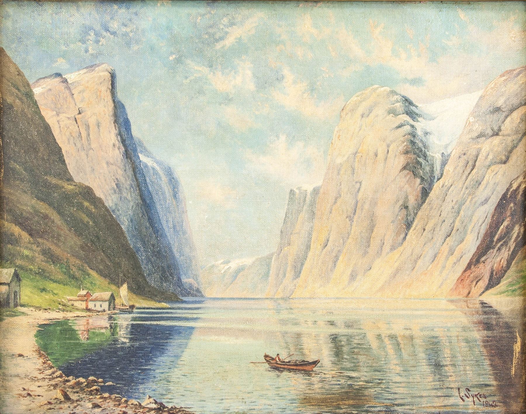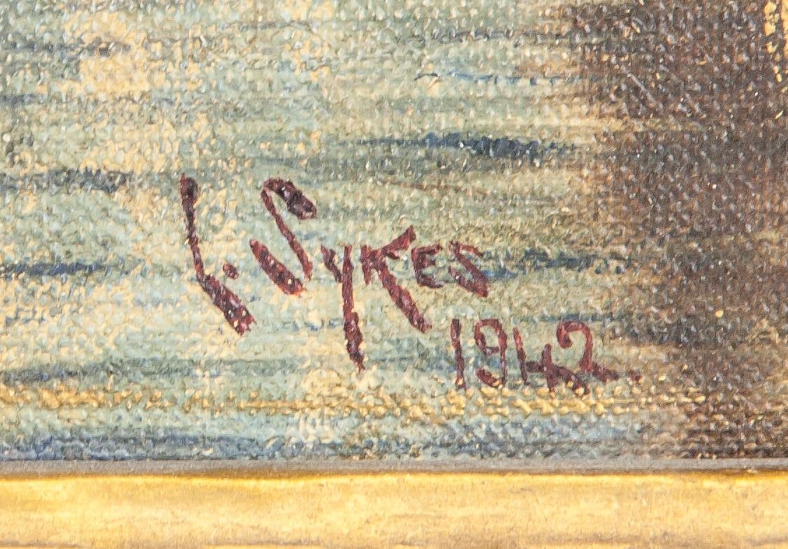 Oil on canvas, framed, "Humminger Fjord", signed L. Sykes on lower right corner and verso, dated 1942, 11 x 14 in (27.9 x 35.6 cm). PROVENANCE: Private collection, North York, ON