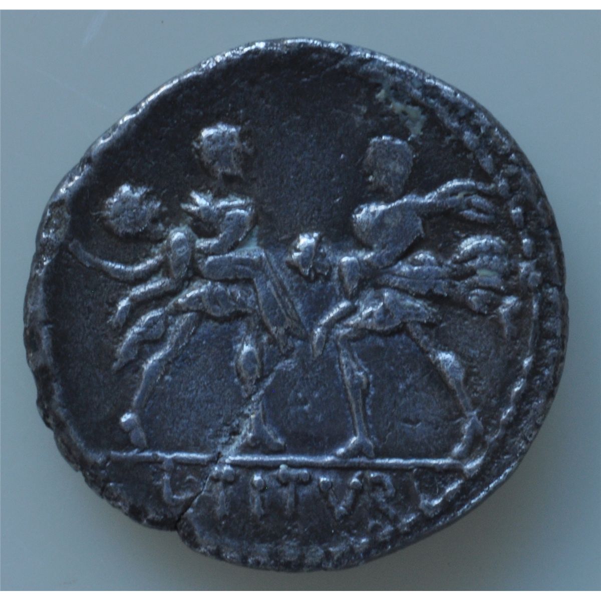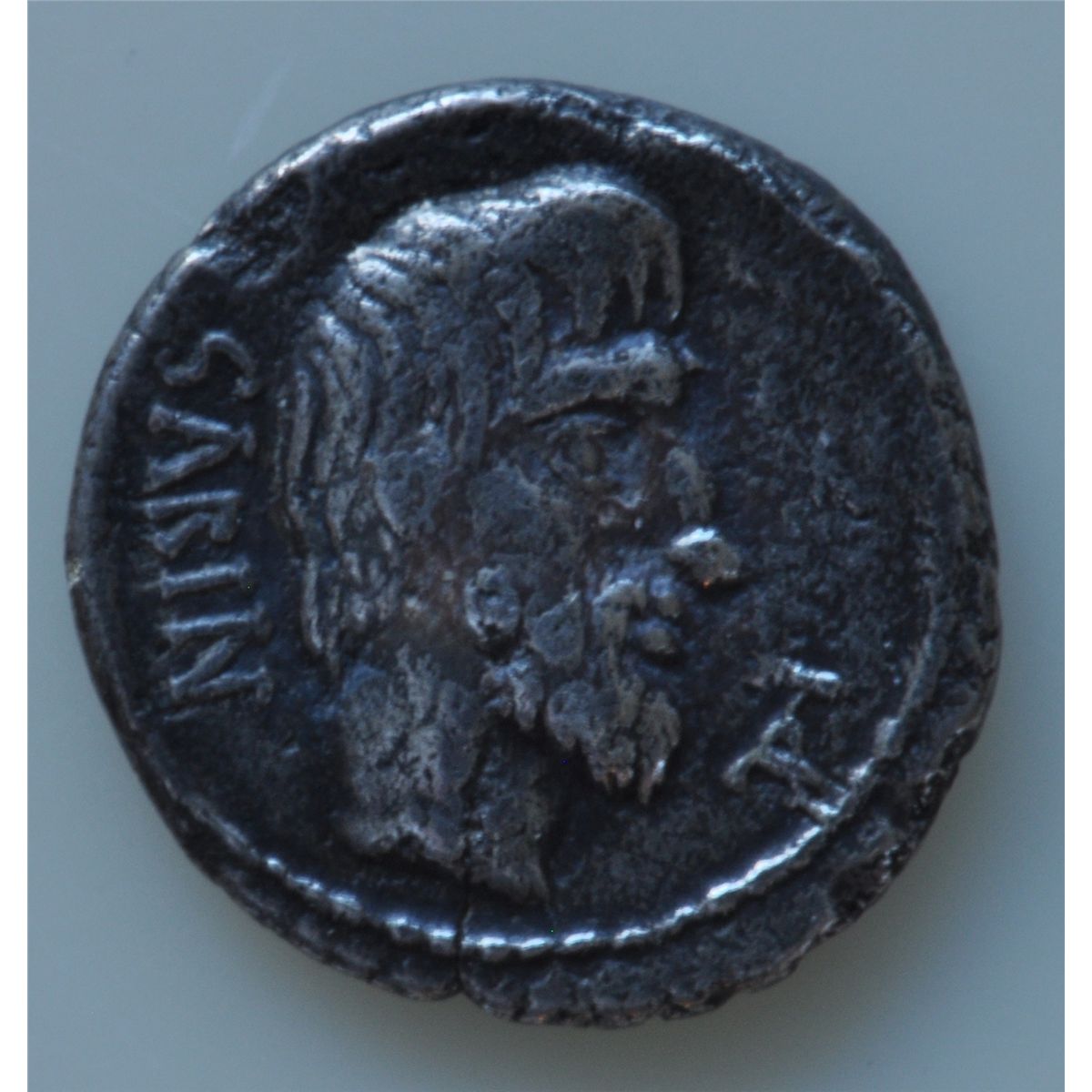 L.Titurius L.f. Sabinus (89 BC) - AR-Denarius Obv: Bare head of King Tatius r. bearded, monogram T A r. of chin. SABIN behind head. Rev: Two roman soldiers running, each holding a Sabine woman (The Rape of The Sabine Women) , L TITVRI in exerge.3.7 grams S-249 Craw 353-1A Fine .