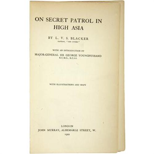 <B>L. V. S. Blacker. </B></I><B><I>On Secret Patrol in High Asia</B></I></B></I><B>.</B></I> By L. V. S. Blacker. With an Introduction by Major-General Sir George Younghusband. With Illustrations and Maps. London: John Murray, 1922.<BR><BR>First edition, second printing. Octavo. xiv, 302 pages. Twenty-six inserted black and white photographic illustrations, plus inserted frontispiece, and three inserted maps. Index.<BR><BR>Publisher's red cloth covers with the insignia of the Queen's Own Corps of Guides tooled and lettered in gilt in the center of the front cover, and the spine lettered in gilt. Engraved book plate affixed to the front pastedown endpaper. Darkened spine and top edges, expected shelf wear, repair to hinges that are beginning to crack but are sound. Altogether a very good copy.<BR><BR>The Corp of Guides was a regiment of the British Indian Army originally formed in 1846 by Lieutenant Harry Lumsden. However, this group was reformed and renamed numerous times, and by the early twentieth century it was known as the Queen's Own Corps of Guides. Captain Blacker narrates his exiting experiences with this select group during World War I.<BR><BR><b>Shipping:</b> Books & Catalogs (<a target="_blank" href="http://www.heritageauctions.com/common/shipping.php">view shipping information</a>)