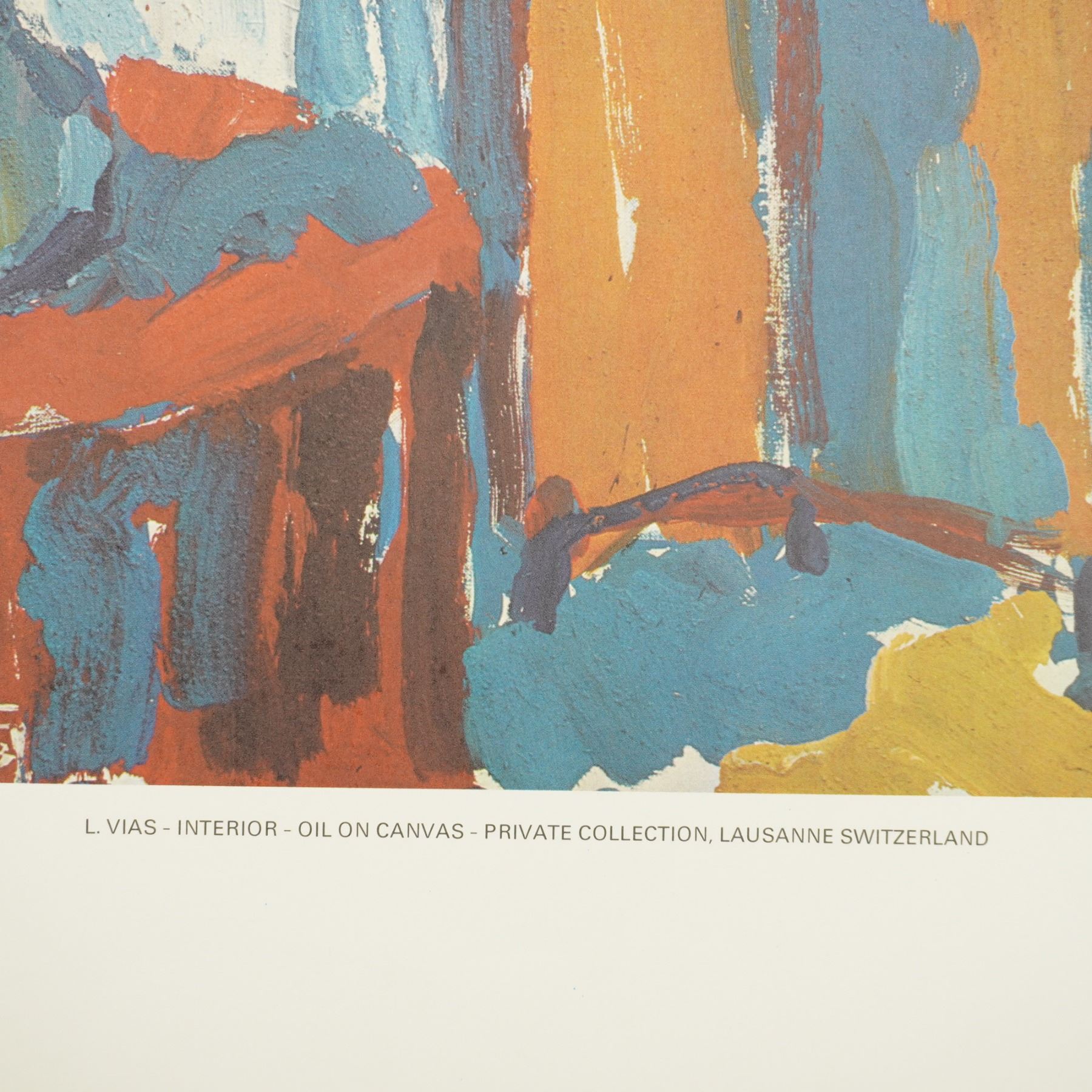 This limited-edition lithographic print features the artwork Interior by L. Vias, originally an oil on canvas painting housed in a private collection in Lausanne, Switzerland. The composition presents a vibrant abstract interior scene, incorporating bold brushstrokes, warm color contrasts, and geometric motifs. The print is a direct lithographic reproduction from the original, as indicated by the embossed collector's seal and numbered label (No. 5404, Series 48 H) on the reverse. Printed on specially manufactured fine art paper, this piece retains the dynamic energy and expressive qualities of the original painting. The print remains in excellent condition with minimal signs of handling and would make an excellent addition to any modern art collection or interior space.