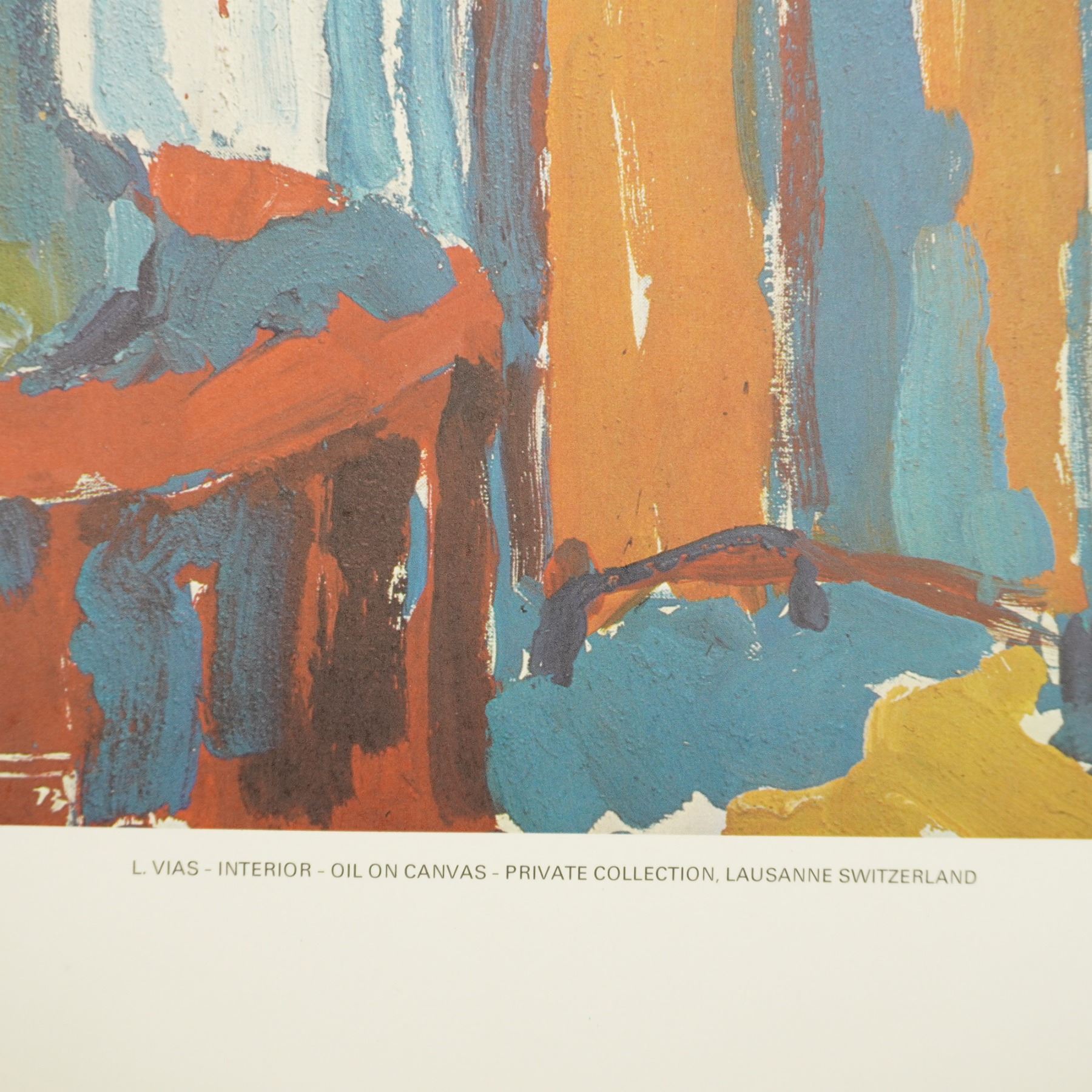 This limited-edition lithographic print features the artwork Interior by L. Vias, originally an oil on canvas painting housed in a private collection in Lausanne, Switzerland. The composition presents a vibrant abstract interior scene, incorporating bold brushstrokes, warm color contrasts, and geometric motifs. The print is a direct lithographic reproduction from the original, as indicated by the embossed collector's seal and numbered label (No. 5404, Series 41 H) on the reverse. Printed on specially manufactured fine art paper, this piece retains the dynamic energy and expressive qualities of the original painting. The print remains in excellent condition with minimal signs of handling and would make an excellent addition to any modern art collection or interior space.