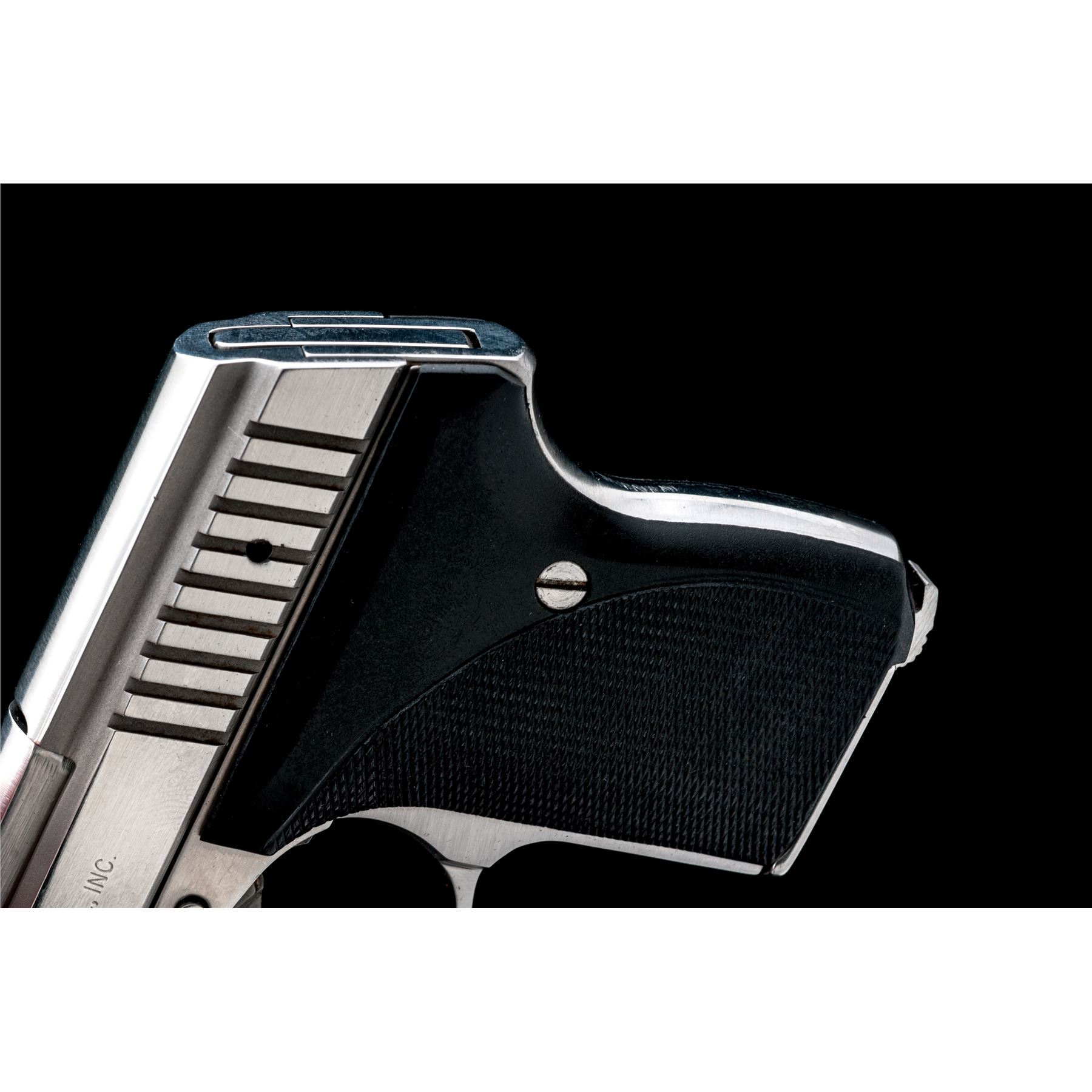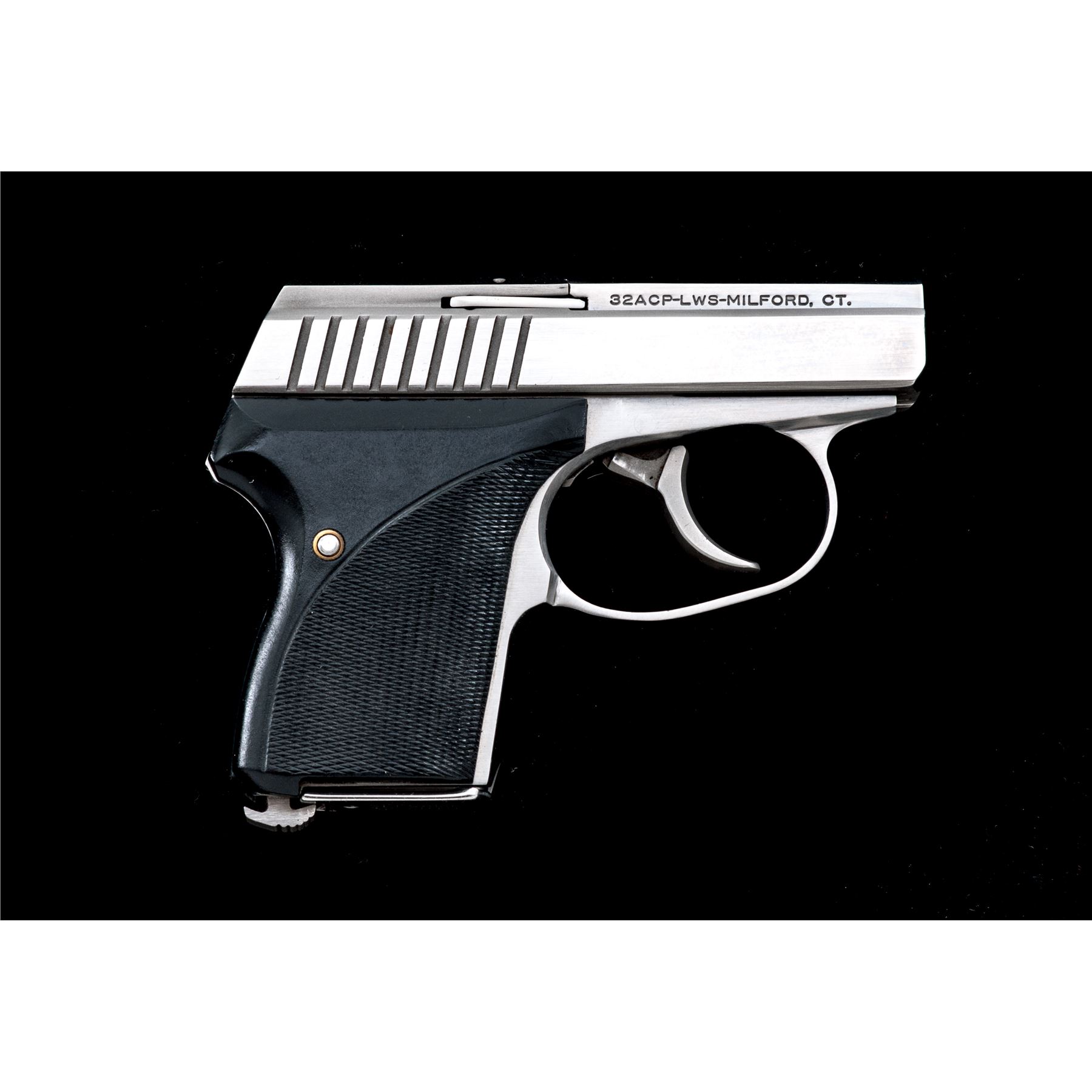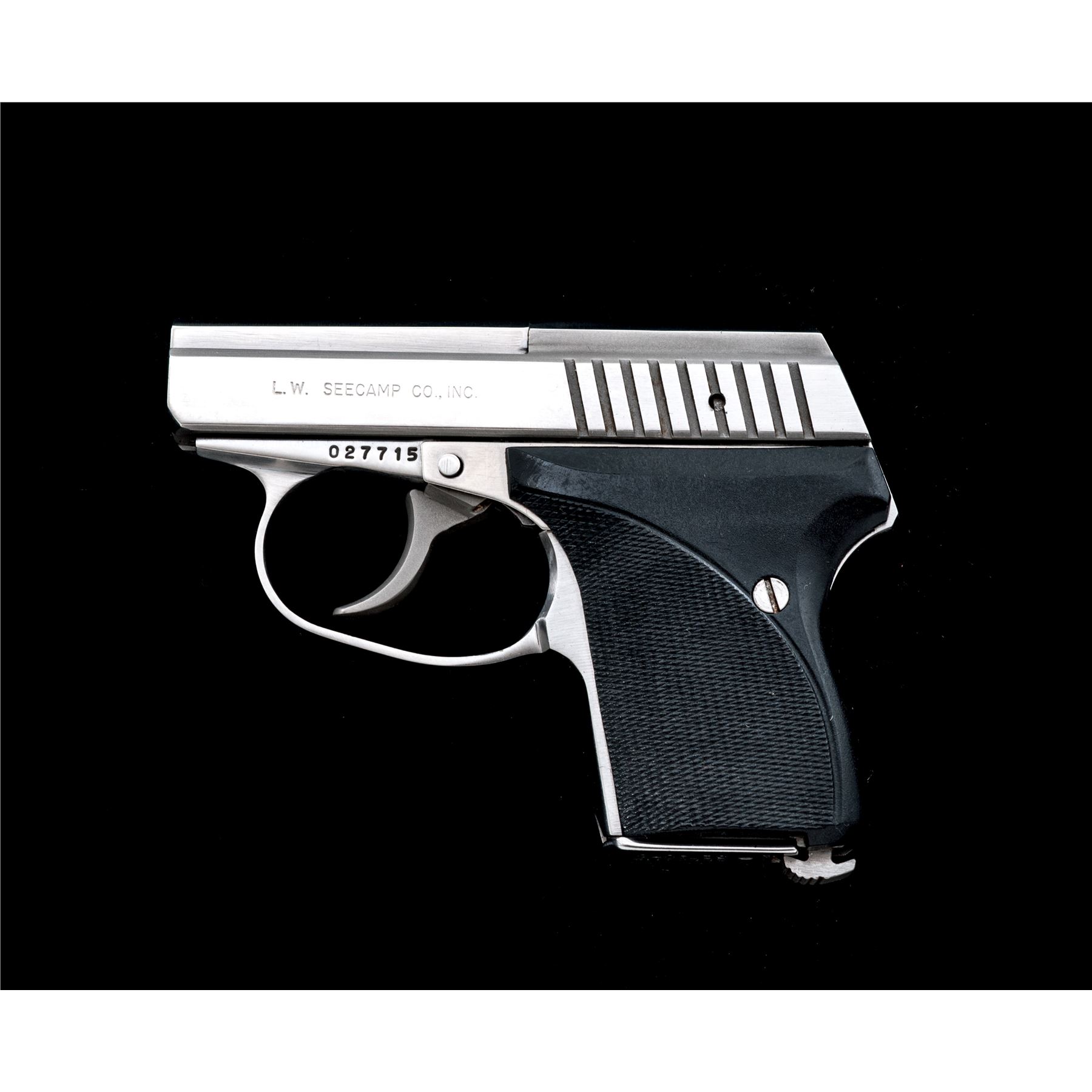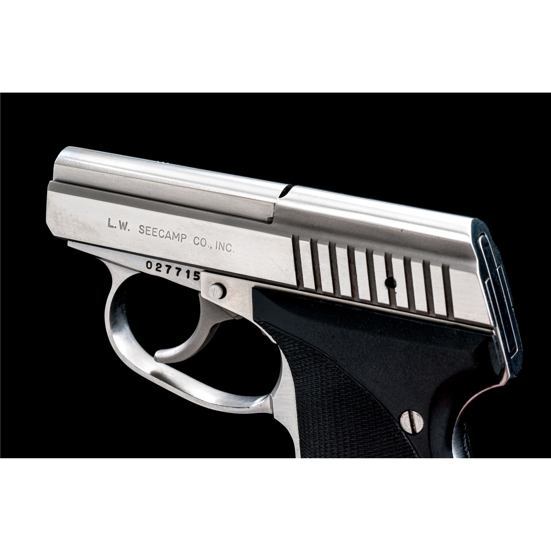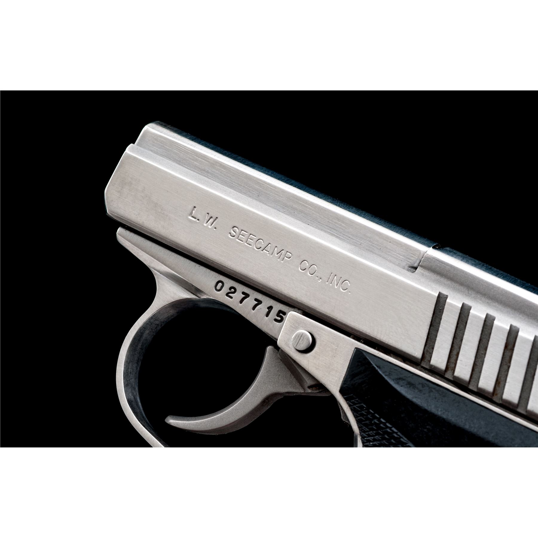 L.W. Seecamp Co. Model LWS32 Semi-Automatic Pistol, #027715, .32 ACP cal., double action only, 2.06'' barrel, stainless steel, no sights, checkered black plastic grips, with one factory magazine.  Metal rates as  near excellent with some fine micro-scratching on front half of slide.  Grips are excellent with only a few insignificant handling marks.  Smooth action, excellent bore.  Est.:  $300-$400. (Modern/PPT)