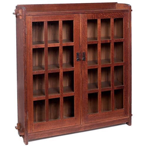 L and JG Stickley bookcase,#645, two doors each with 12 panes of glass and original copper hardware, supported by slab sides and key tenon construction chamfered board back, original finish, signed with Handcraft decal, minor stains to top,52in.w x 12in.d