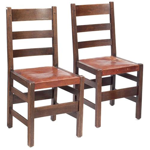 L and JG Stickley side chairs,#350, pair, ladderback form with three horizontal slats over original leather seat, damage to one seat, original finish, unsigned,17in.w x 16in.d x 35in.h,very good condition