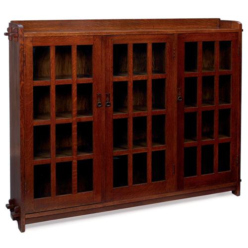 Exceptional L and JG Stickley triple door bookcase,#647, twelve panes per door with original hammered copper hardware, slab sides with keyed tenon construction, fine original finish, signed with Handcraft decal, a great example of this form,72in.w x 12in.