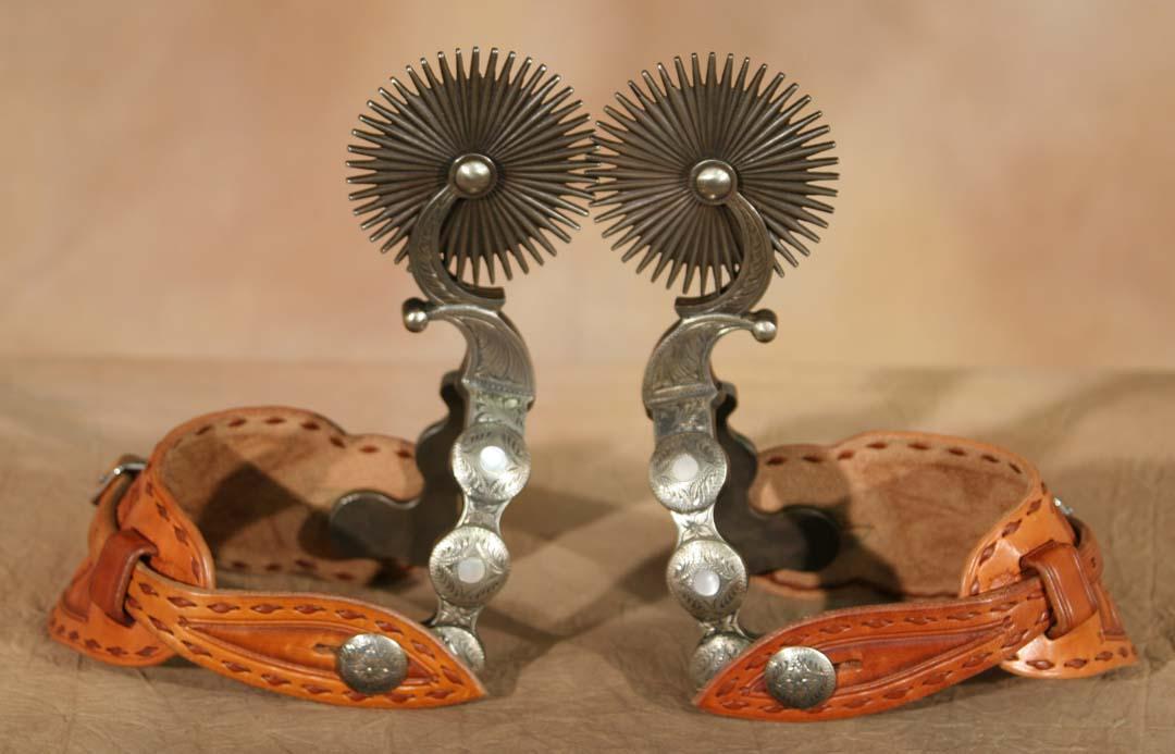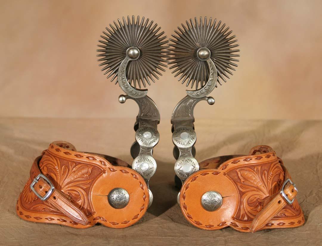 L & M Spurs. Denny Lytle & James L. Mower . Intricately engraved, double mounted with inlaid mother of pearl. Spanish style shanks with 3" 45 point rowels. Gordon Andrus buck-stitched, hand carved straps. (est $2,000-3,000). For condition reports please visit: www.auctioninsantafe.com/cr2011.pdf