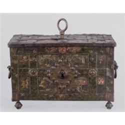 német, 17. sz., kovácsoltvas, festett díszítéssel, eredeti kulcsal, belsejében az eredeti muködo zárszerkezet takarólemeze áttört, trébelt díszítéssel, 21*32*19,5 cm