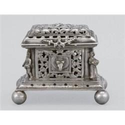 német, 19. sz. vége, ezüst, monarchiás behozatali jeggyel, áttört díszítéssel, sarkain öntött alakok, 383 g; m: 9 cm