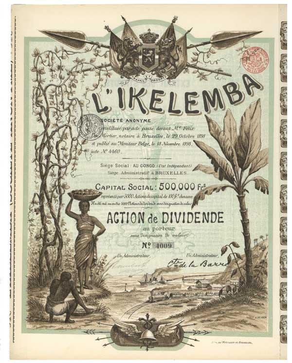 1898, Belgium. Likelemba. Multi-colored. Large vignette of a man and woman working with a train in the background. Top center vignette of a crest. Imprinted vignette at center of a plant. Attached coupons. Uncancelled and extremely fine.