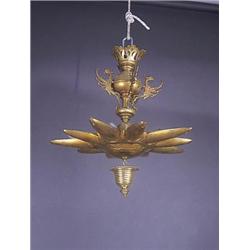 Lámpara de diez lces en latón dorado, Ffs.S.XIX. Altura: 70 cms.En forma de estrella y v stago con cuatro placas recortadas en forma de dragón. Salida Euros 150 - Salida PTS 24.958