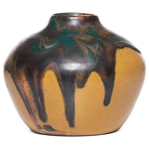 Léon Pointu vase, squat form in yellow with brown, green and orange drip, signed,3.5in.h, excellent example of this French pottery