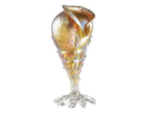Blown seashell form iridescent glass. Coral from tintless glass. On the surface Candia Papillon decoration. Lötz, circa 1900 Size: 31 cm