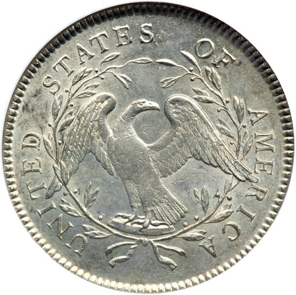 The present specimen is remarkable for its fresh color and frosty surfaces on both sides. It sits squarely atop the assigned grade classification and has lovely silvery brightness. Any marks are held to a minimum. Better still, there appear to be no adjustment lines on either side, a noteworthy observation which qualifies for special mention. The satiny surfaces are aglow with silvery color, devices sharper than on some, but lacking completeness on the eagle's wings and chest feathers, which, as often occurs, is softly brought up. High grade flowing hair silver dollars are the dominant theme among serious, advanced early dollar collectors, with comparatively few Mint States sold in any calendar year. Bowers (1993) estimated only four to six pieces remain in MS64 or better grades. Look for this beautiful MS64 coin to realize a strong price after much spirited bidding. Pop 1, finest graded 2 leaves at NGC. The NGC population also breaks down the various varities and reports two BB-20 examples in 65.