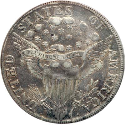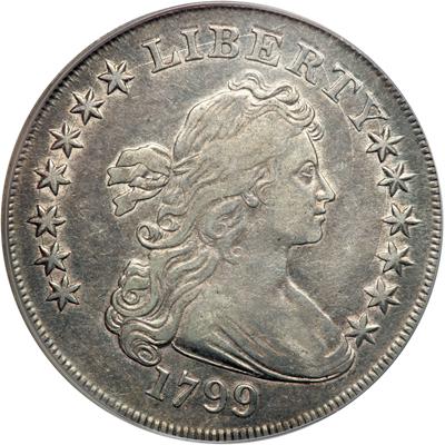 1799 B-15, BB-152. Rarity 3 Irregular Date. PCGS graded EF-40. Initial traces of luster can be found at the stars and within the reverse letters of the legend, matte-like neutral-gray surfaces of this attractively original specimen. A blend of lighter gray graces the high points on both sides. The strike is somewhat soft in areas of the hair but less so on the reverse, where the design elements such as E PLURIBUS UNUM and the shield lines are complete. Pop 1; 2 finer; 1 in 50; 1 in 64. Only 4 examples graded for the variety at PCGS. (PCGS # 40045).