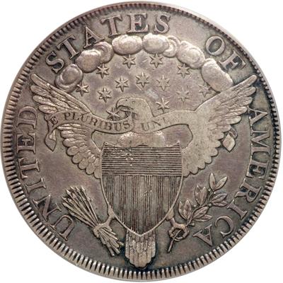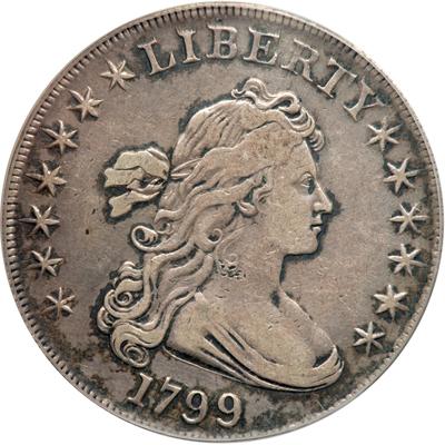 1799 B-6, BB-162. Rarity 4. PCGS graded VF-25. Attractive surfaces exhibit multiple levels of toning from light silver gray in the open areas and tops of the motifs to deep grays in the protected areas. Nicely struck for the variety, with some normal circulation wear present, though nothing approaching abraded. Higher grade examples are rare (PCGS # 40053).