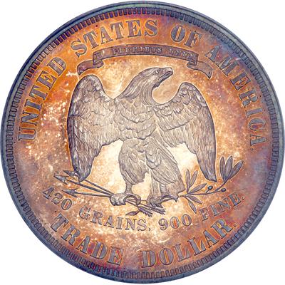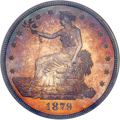 1879 Trade Dollar. PCGS graded Proof 64 Cameo PQ. Wonderful golden toning on both sides. Lustrous with full watery mirrors and almost devoid of any hairlines. A very pleasing example of this Proof-only issue. So ends the discussion of the luster. Now on to the detail: This Trade Dollar is not just close to, but completely and sharply struck, with terrific detail at the key features such as the stars, Liberty's gown folds, and the eagle's plumage. Only 1,541 pieces struck. In our opinion this coin should be re-submitted to the grading service for an upgrade. Pop 103; 64 finer (PCGS # 87059).