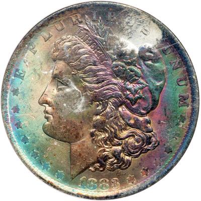 1883-O Morgan Dollar. NGC graded MS-64. Star. Magnificent obverse toning consisting of vivid separation between violet, gold, rose, and sea green with all colors surging up iridescently.
