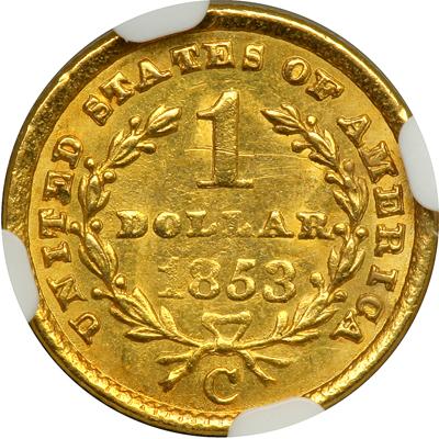 1853-C $1 Gold Liberty. NGC graded MS-63. Boldly struck on slightly granular surfaces. Plenty of mint luster remains. Only 11,1515 minted. The strike on both sides of this coin is typical of the issue. There is some softness of detail on the obverse over Liberty's brow and on top of the hair curls; rim dentils are nearly all missing; and on the reverse over the 18 in the date and the second L in DOLLAR, with similar lack of detail in the dentils. There is a short horizontal distraction through the 1 of the denomination and a tiny mark on the rim above E in STATES; a small pit by the lowest star. Extensive luster everywhere. Truly exceptional for the issue, which tends to come circulated, and in the realm of surface preservation it has very few peers (see the population figures below). The fields are frosty, not prooflike -- a feature that suggests it was struck later in the die's life. Vivid-gold color flows over both sides. Pop 13; 3 in 64, 1 in 65 In a new NGC 4 pronged holder (PCGS # 7522).