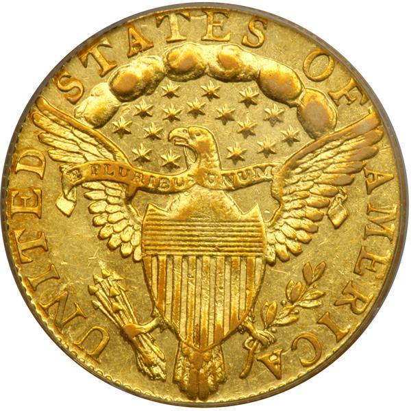 It is believed -- based upon estimates by Walter Breen -- that only 963 examples were struck of the first quarter eagle. Interestingly, these were of a one-off design, a motif that would be discontinued after these 963 coins left the press. Within this small population there are two die varieties -- two different reverse dies differing from each other only by minute details.