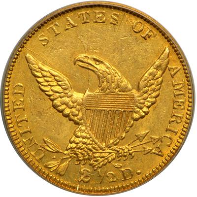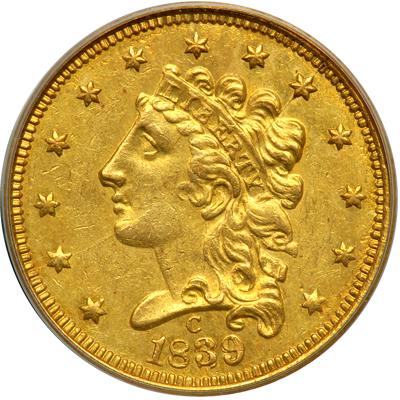 1839-C $2.50 Classic Head. PCGS graded MS-61. A lovely full strike exhibiting traces of mint luster and all a pleasing pale golden color. A total mintage of 18,140. The lowest mintage of the short-lived William Kneass or "Classic" head type was registered by the first mintmark issue, the 1838-C, of which only 7,880 were struck. The mintmarked issues of the next year, 1839-C, 1839-D, and 1839-O, are all scarce, with the typically encountered grade being Very Fine or, occasionally, Extremely Fine. Any coin in Mint State grade is a rarity. At the time, the numismatic community -- consisting of no more than a couple hundred widely scattered enthusiasts -- took no note of mintmarks, and not even the Mint Cabinet saved specimens. Hence, the extremely low census in Mint condition: Pop 1; 2 finer in 62. (PCGS # 7699).