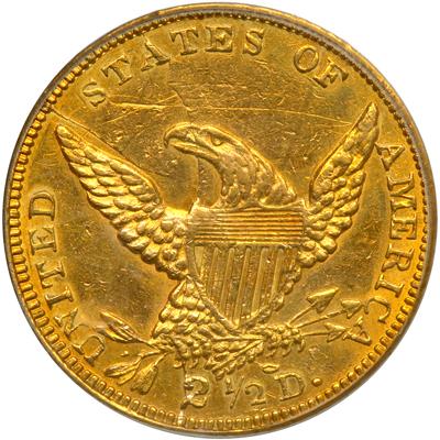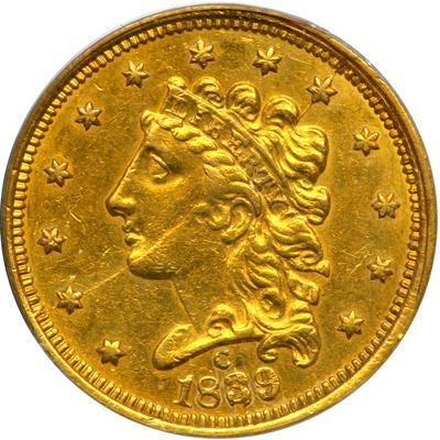 1839-C $2.50 Classic Head. PCGS graded AU-55. Well struck with bisecting die crack from star 2 thru star 9. Lovely golden toning on both sides. While a relatively common coin in lower grades, the '39-C is very elusive in solid AU condition or higher with tremendous demand from collectors at this level. This is an attractive example, and has all of the qualifications for the grade and then some. The surfaces are frosty and light reddish-golden with only minimal abrasions for the grade. What seem to be defects on many 1839-C quarter eagles are actually either die cracks or planchet depressions common to this variety. First of the Charlotte Mint quarter eagles. And distinctive in having the mintmark on the obverse, above the date. Only 18,140 struck. Pop 28; 8 in 58, 1 in 61, 2 in 62 (PCGS # 7699).