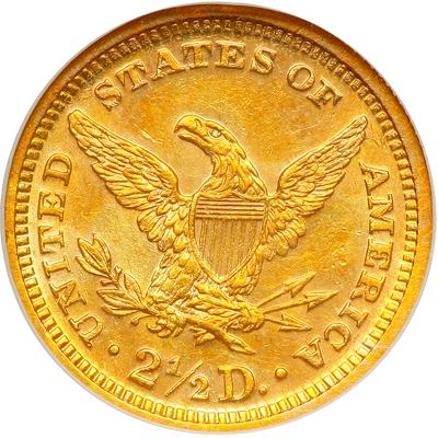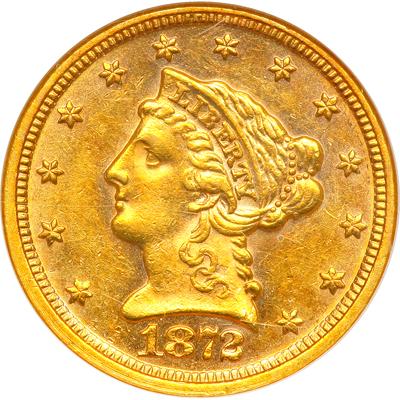 1872 $2.50 Liberty. NGC graded AU-58. Nice golden toning, lustrous and well struck. Only 3,000 minted of this very scarce Philadelphia Mint issue. Pop 21; 12 finer; 6 in 61; 3 in 62; 3 in 63. (PCGS # 7815).