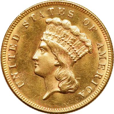 James B. Longacre's "Indian Princess" head is one of several he modeled on the Greco-Roman Venus Accroupie profile which had already served for the gold dollar and double eagle, and, from 1854 to 1889, this $3 gold piece. The feathered headdress is supposed to emphasize "national character."