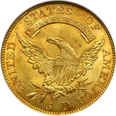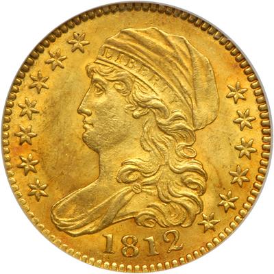1812 $5 Capped Draped Bust. . BD-1, Breen-6466. NGC graded MS-64. Well struck with intense frosty mint luster on a lovely problem-free planchet. Lovely natural golden-orange overtones add to its beauty. A highly glossy example that has extra frosty surfaces plus lovely patina with a bold, if not quite a razor sharp strike. No more than the luster comes a desirable strike on these early pieces, since the mint's quality suffered by a lack of more sophisticated equipment at the time this was made. This piece is struck with almost scientific exactness throughout the stars, hair curls and cap folds, on the obverse, and even the small clasp at Liberty's shoulder has its central squiggle visible. The reverse eagle is where the sharpness falls down a bit, with indistinct feathers on the neck and one wing, as well as some softening of the shield lines, about on par with other MS64 examples seen. Partly this is due to a few faint adjustment marks across the center of the reverse. All in all a first-rate specimen of the Type for the dedicated numismatist. Pop 34; 9 finer by a point (PCGS # 8112).