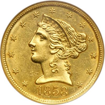 1858-C $5 Liberty. NGC graded MS-63. A needle sharp strike on a slightly defective planchet (note some roughness in the reverse fields) and untoned. The 1858-C is a relatively obtainable issue in all grades but that does not mean it is frequent in Mint condition, not by a country mile! Choice Mint State pieces, in particular, are highly prized items and when available, tend to be the focus of strong bidding activity. The striking details are prominent for their crispness here. There is some minor weakening in the dentils on the obverse and reverse; centers are extremely bold. In line with the MS63 grade, the fields are bright and frosty with a slightly reflective sheen. The only significant surface marks are, as already described, a few rough areas around the eagle (done at the time of minting, more likely than not); otherwise there are no flaws, tarnish streaks, or edge bumps. In short, a very respectable high grade example. If you have allotted yourself only one C or D mint gold coin purchase out of this sale, and desire a choice one, then we direct your attention to the present 1858-C half eagle as it makes it a good candidate for such a purchase. Pop 2; 1 finer by a point (PCGS # 8277) .