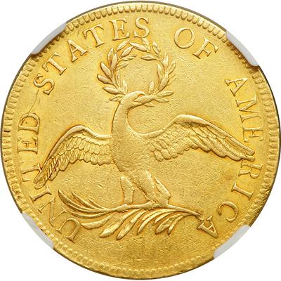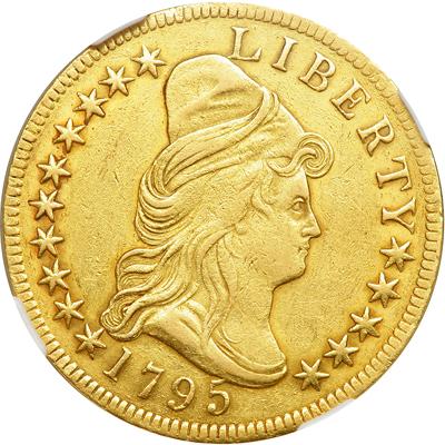 1795 $10 Capped Bust. 13 leaves. NGC graded AU-50 BD-2, R-4+. Light even toning in a new 4 prong NGC holder. Bright yellow-gold luster on satiny surfaces that have some granularity to them due to minor abrasion contact with other coins. There is a short hairline scratch in the field between D and S on the reverse. A touch of weakness is seen at the eagle's breast and legs on the reverse, as well, but here it is probably that a design flaw is the culprit, since the high point of the opposite side lies opposite this area on Small Eagle tens of 1795-97 which often did not allow for sufficient metal flow into the deepest die recesses. The luster that remains is located around the stars and legends mainly, with a few traces of frost in the portrait. Pop 2; 24 finer. (PCGS # 8551).