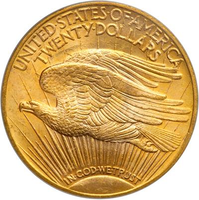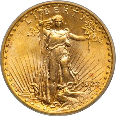 1922 $20 St. Gaudens. PCGS graded MS-65. Nice golden toning. This is a virtually blemish-free case in point of the scarcer 1922 in this grade: sleek gold in color, with Gem quality mint bloom that grabs hold of the full effect of the careful preservation since it was made. A great deal of stress is laid on the strike detail of these, as well, and this piece is sharply struck on all devices (PCGS # 9173).