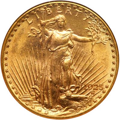 1925-D $20 St. Gaudens. NGC graded MS-65. A frosty gem specimen with delicate golden sunset toning on both sides with hints of light olive about the borders. Lovely rich shades of color. A key date. About as close to watertight perfection as can be expected, this vibrant 1925-D makes for eye-popping originality when examined closely and with a discerning eye. As soon as one sees the booming luster, it comes as no surprise everything is razor-sharp on all devices. All sorts of succulent thoughts come to mind when we examine it, but the best that can be said its that the coin easily fits into the fabric of MS65 standards. It is a lock-solid MS65. And it has the enormous advantage that it can never be repeated in many auctions due to the low population, which we list at the end of this discussion. When a numismatist has given you those lengthy virtues, which is about all he ever thinks of, then the baton is passed to the auction bidder to tell the world what he believes the coin thus described is worth. Pop 7; 1 finer in 66 (PCGS # 9181) .