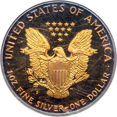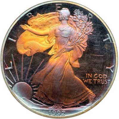 1992-S Silver Eagle. NGC graded Proof 69. Stunning shades of gold, violet and electric blue cover the obverse while the reverse is a sunset gold. Such pronounced coloration is certainly worthy of a premium bid from the admiring collector.