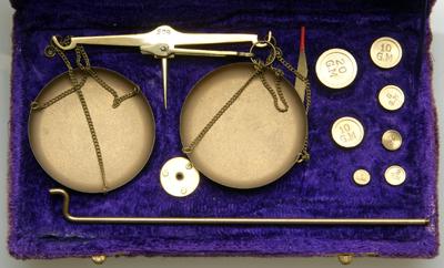 Antique portable Gold Scale in fitted case. Extremely Fine. 8¼" by 5". Country of origin and date uncertain. Appears to be 19th or early 20th century. The brass weights are in grams with no discernible markings. Appears to be complete and in excellent condition. All housed in a custom purple velvet case.