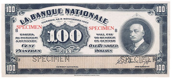 LA BANQUE NATIONALE. $100.00. Nov. 2, 1922. CH-510- 22-10S. A Specimen. PCGS graded UNC-62. PPQ.