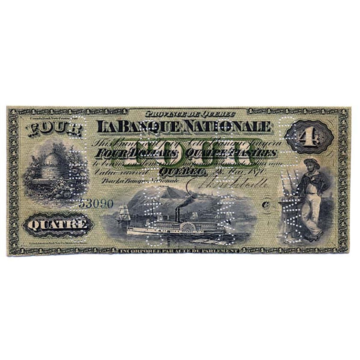 LA BANQUE NATIONALE. $4.00. 28 May, 1870. CH-510-12-02. No. 53090/C. Cancelled. Very Fine.