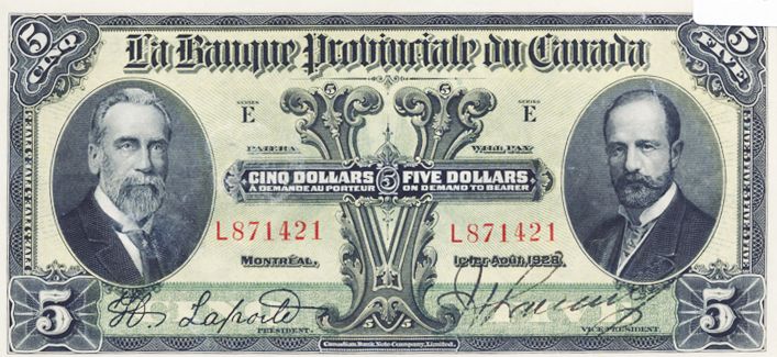LA BANQUE PROVINCIALE DU CANADA. $5.00. 1 Aout, 1928. CH-615-14-08. No. L871421. Unc.