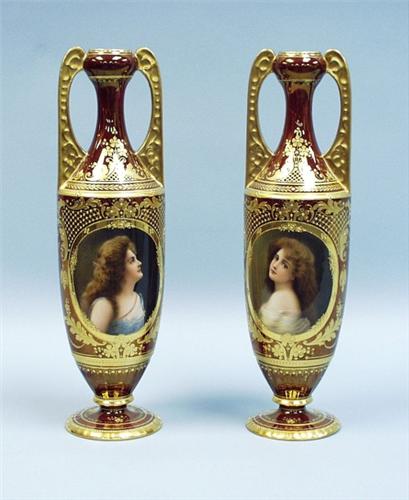 LA CYGALE and NORA. A pair of fine antique Old Vienna porcelain vases. The campagna form vessels with elongated necks and waisted base. Each with a pair of gilt scroll handles. Burgundy ground hand painted by Wagner with the portrait of a young lady within a relief gilt frame. Each signed, titled, hallmarked and numbered, 13 1/2" high.