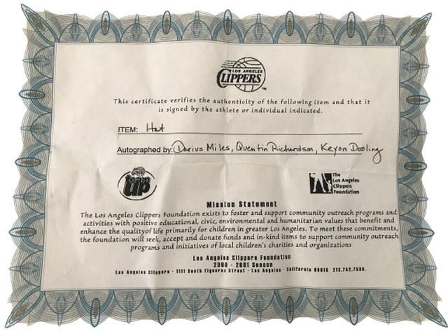 Certificate of authenticity provided by the Los Angeles Clippers foundation 2000 to 2001 season