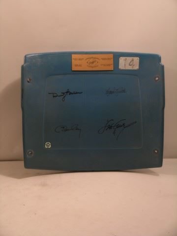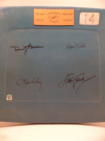 Dodgers Record Setting 30 Homeruns Limited Edition plastic chairback with a plaque on the front and signed by Dusty Baker, Reggie Smith, Ron Cey, and Steve Garvey. Includes the seat number 14. Purchased directly from Dodger Stadium and there are no others available like this with the signatures and seat number available for sale. (approx. 19 1/2" x 17)