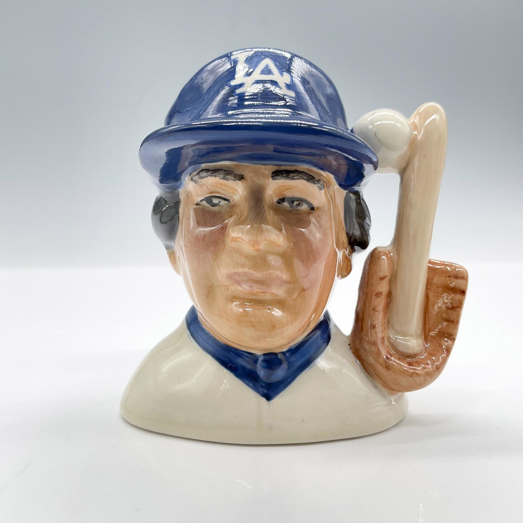 Miniature character jug of a Los Angeles Dodgers player. White baseball, baseball glove, and bat as the handle. Marked: Royal Doulton backstamp, The Property Of Royal Doulton Tableware LTD. Not Produced For Sale.